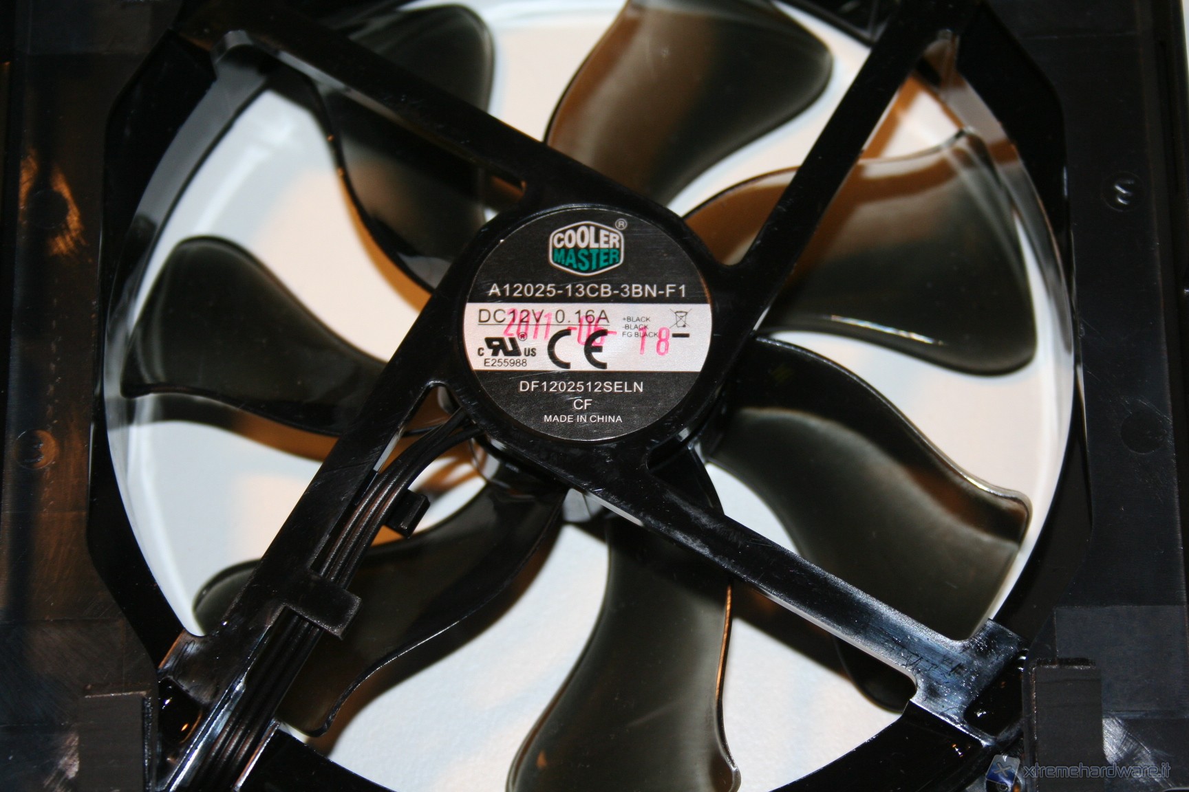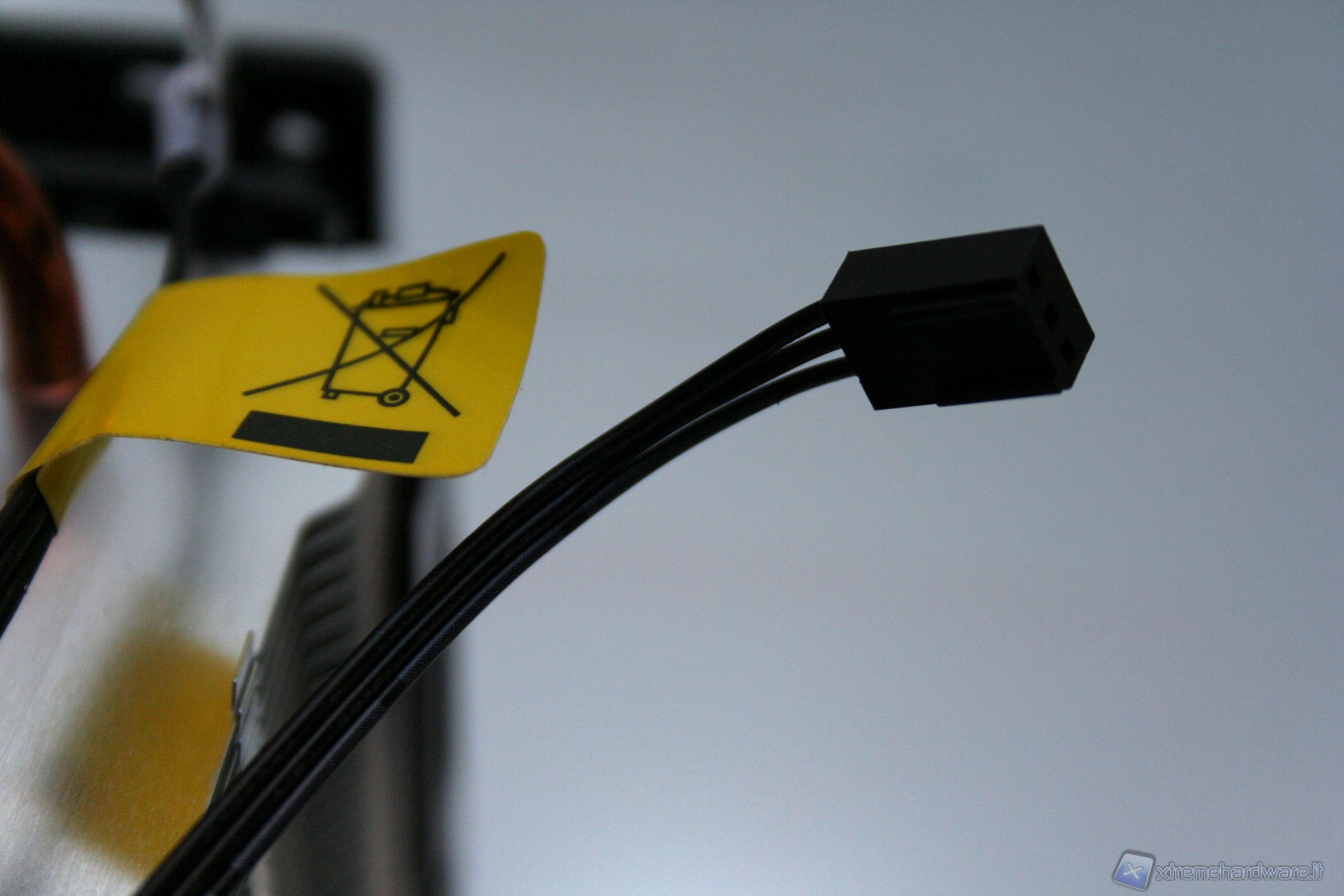 La guaina della ventola non è presente, invece il rivestimento sembra essere la stesso utilizzato per il cablaggio degli alimentatori modulari Cooler Master, dalla buona fattura, pratici e poco ingombranti.