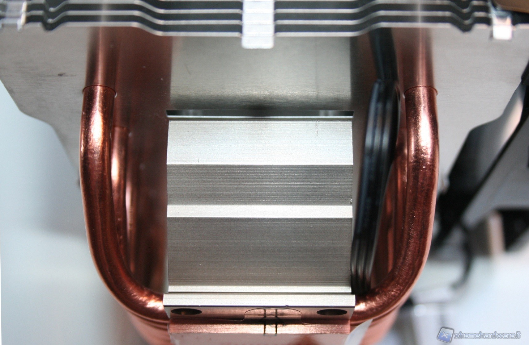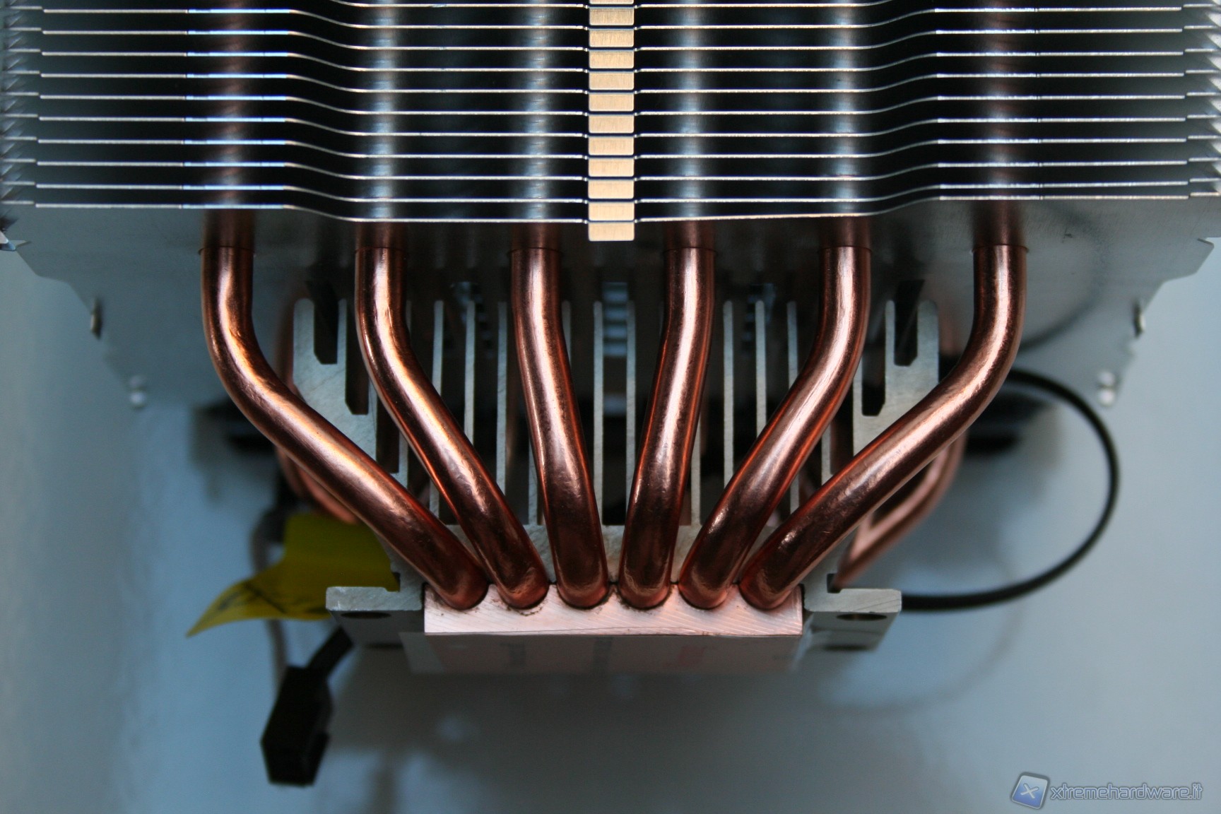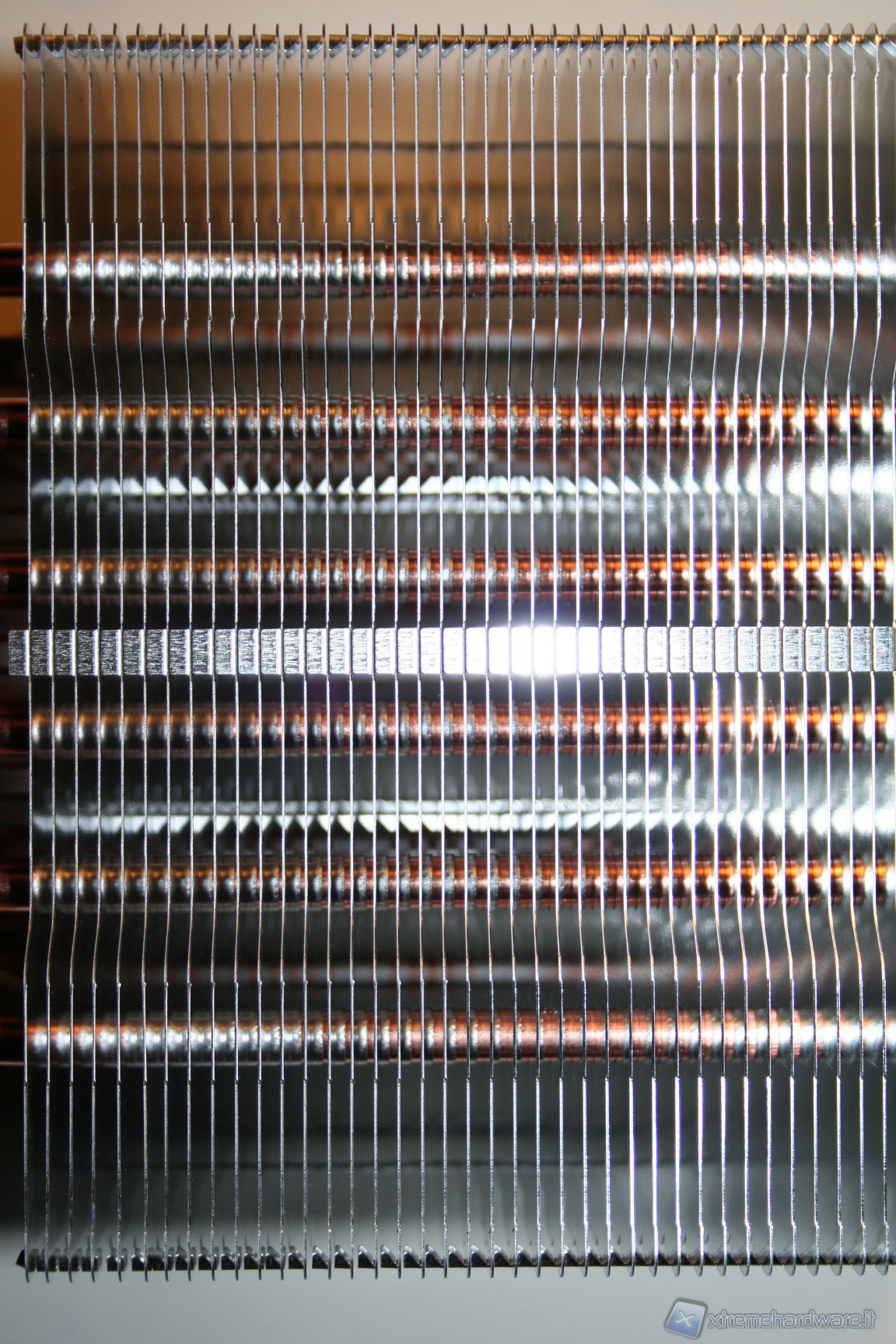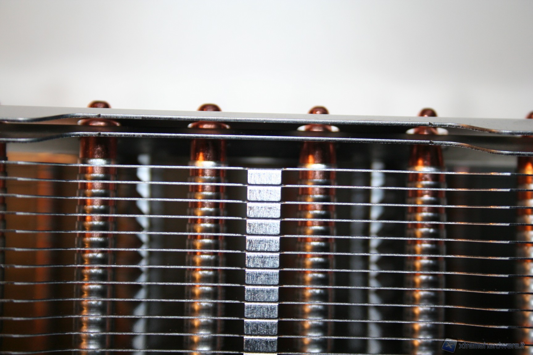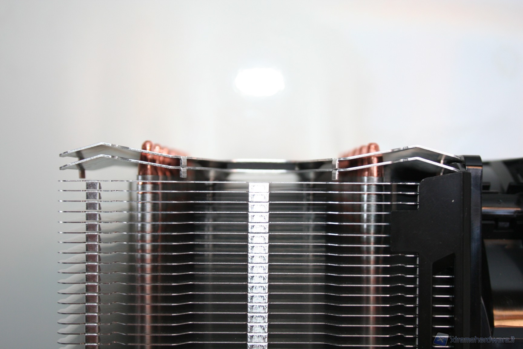 Le heat-pipe sono incastonate tra la base, a contatto con l’IHS della CPU, ed un piccolo dissipatore passivo, realizzato per migliorare l’efficienza a basse temperature. Il design presenta una disposizione delle lamelle finalizzata alla riduzione della resistenza del flusso d’aria, il che significa che quest’ultimo procederà con più regolarità tramite il corpo radiante, il quale presenta anche delle fessure interne che aumentano anche la superficie dissipante; ciò permetterà quindi di ottenere migliori risultati, in teoria, anche con ventole aventi sia un basso regime di rotazione sia una esigua pressione statica.