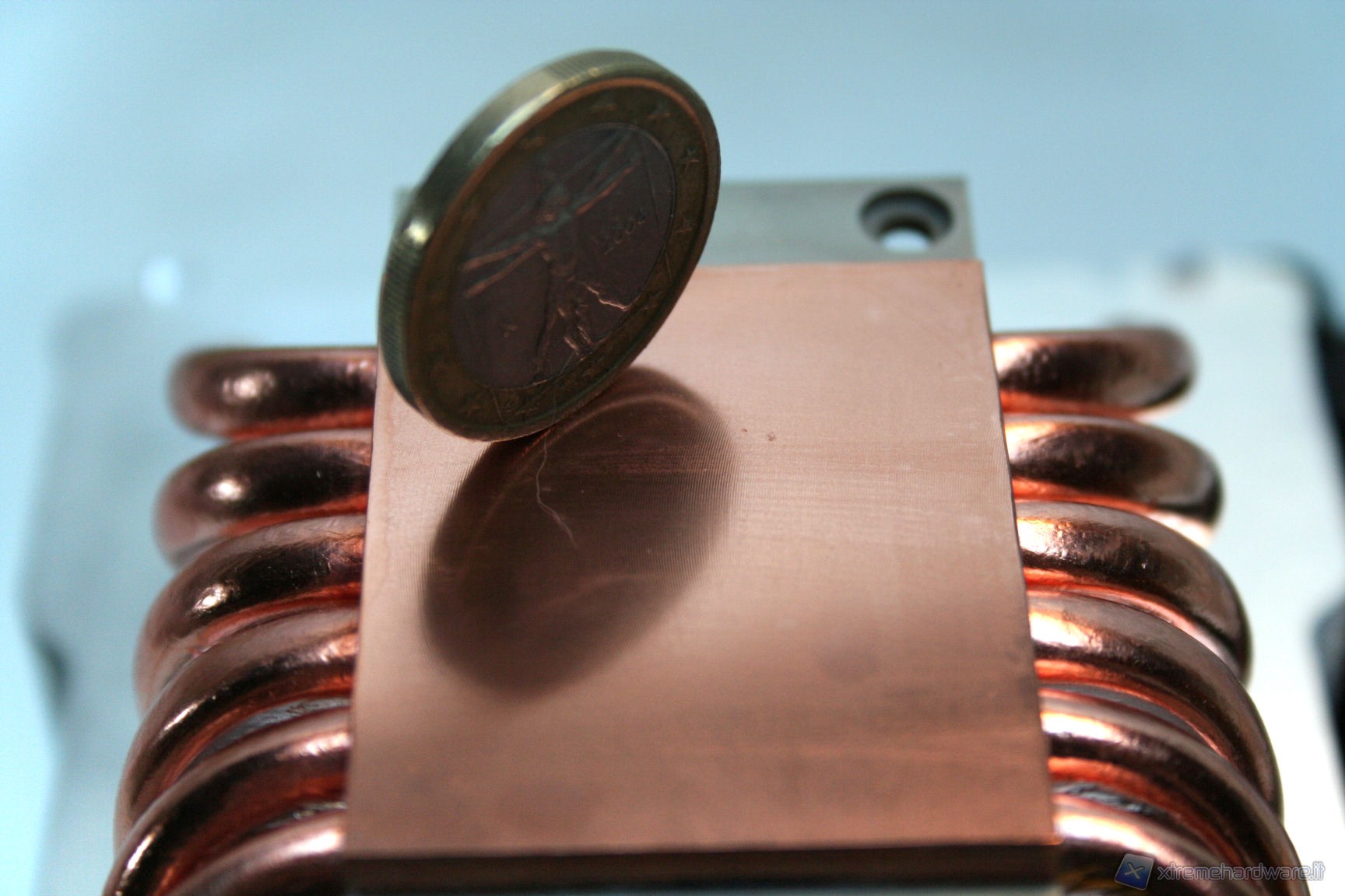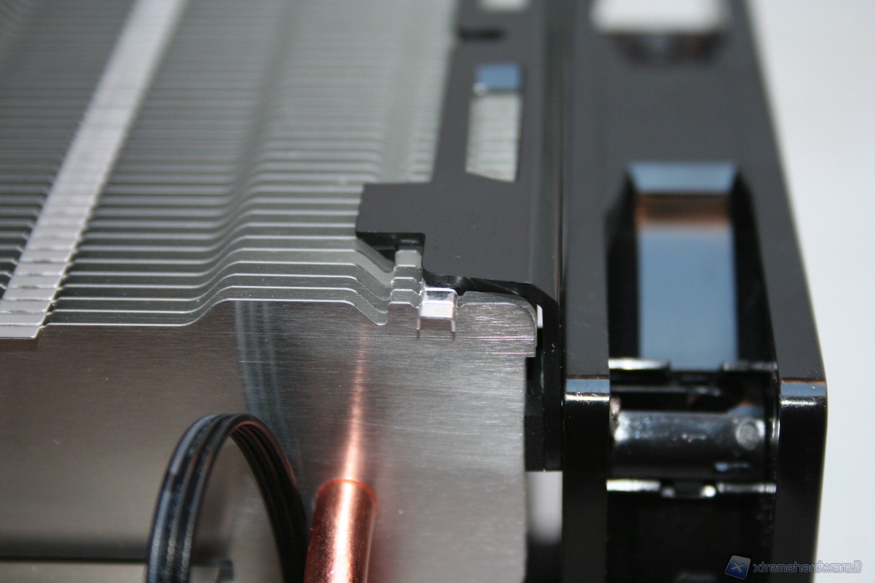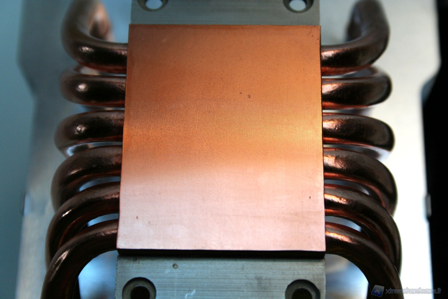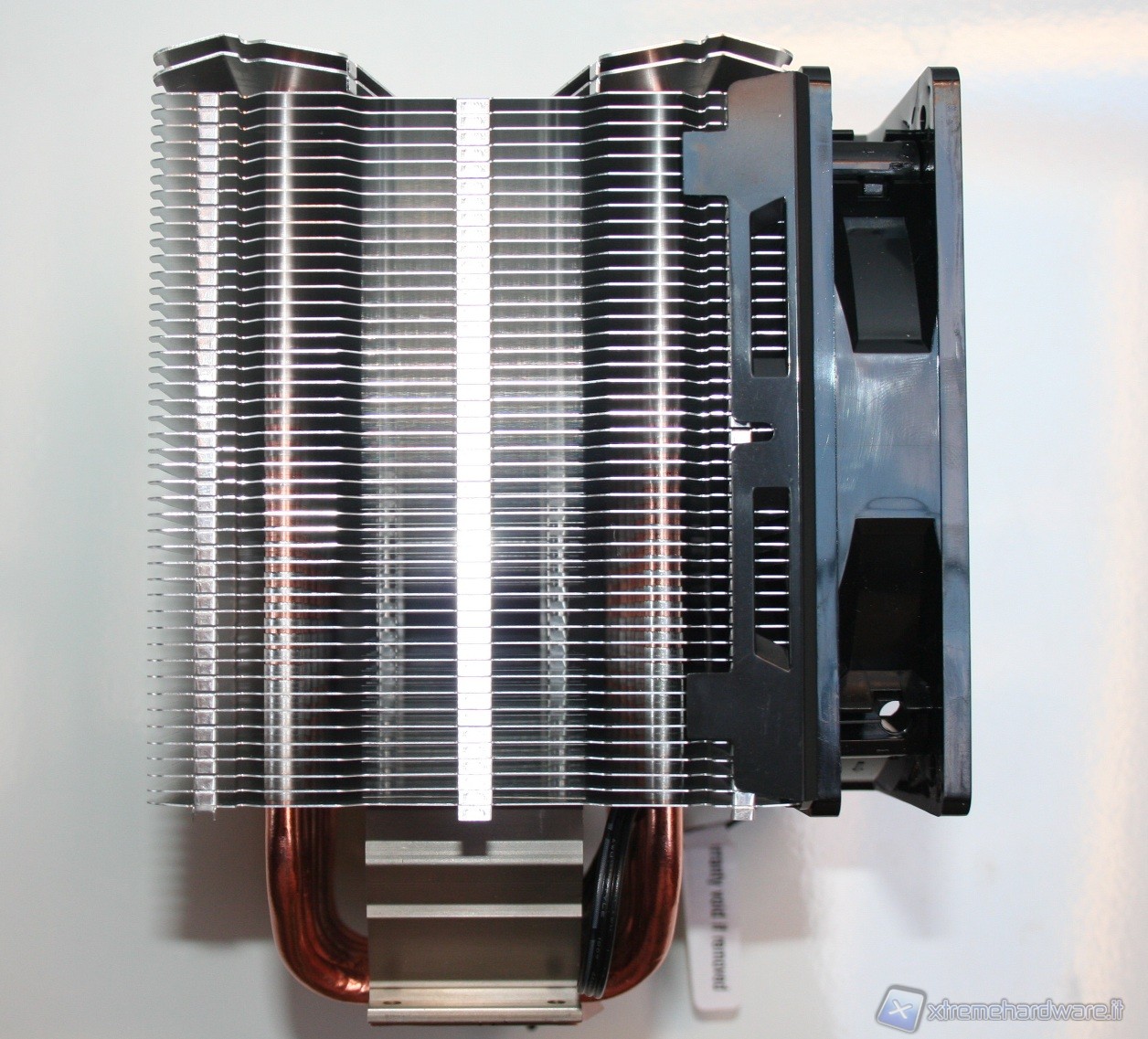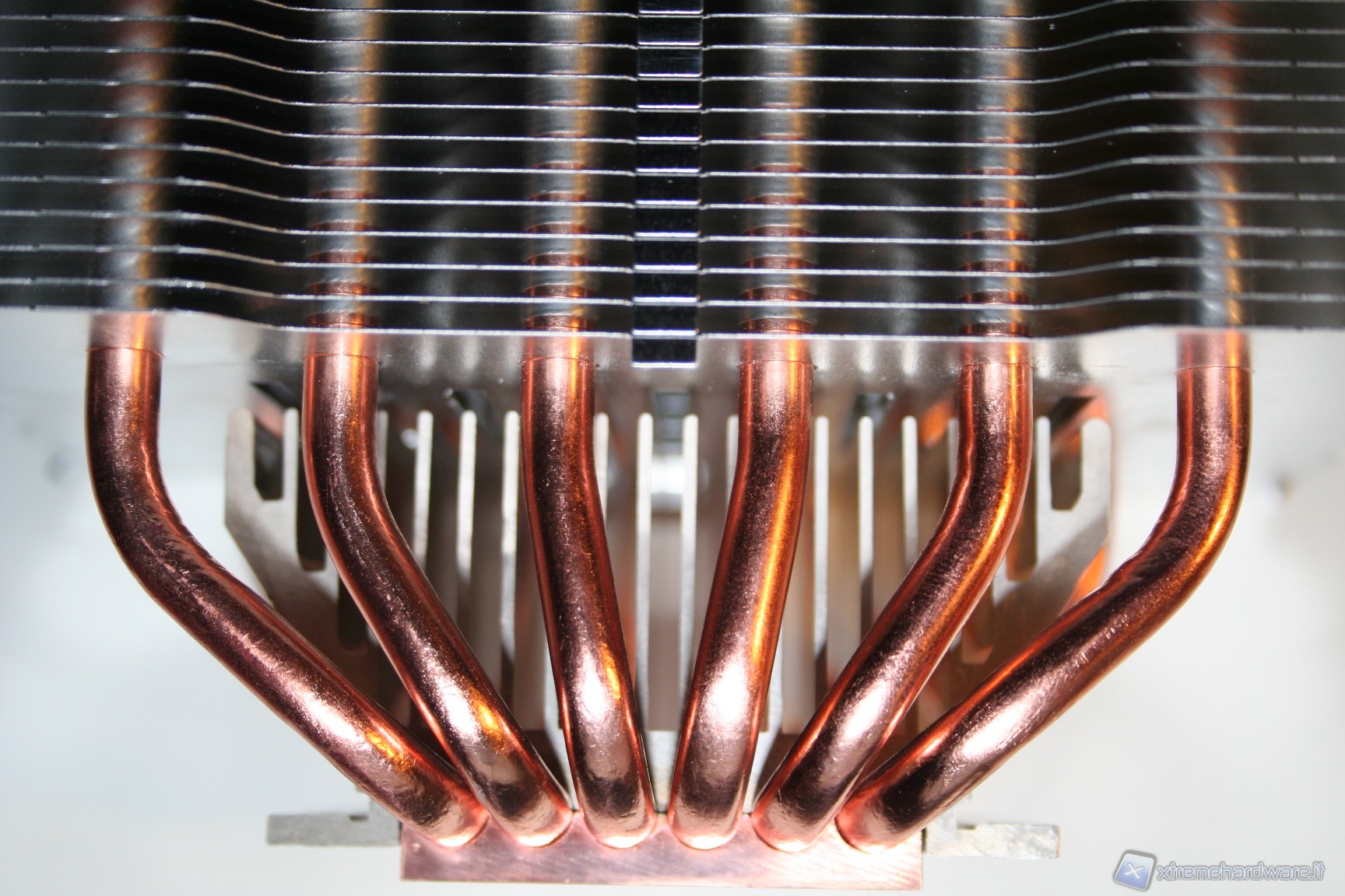 Le heat-pipe sono incastonate tra la base, a contatto con l’IHS della CPU, ed un piccolo dissipatore passivo, realizzato per migliorare l’efficienza a basse temperature. Il design presenta una disposizione delle lamelle finalizzata alla riduzione della resistenza del flusso d’aria, il che significa che quest’ultimo procederà con più regolarità tramite il corpo radiante, il quale presenta anche delle fessure interne che aumentano anche la superficie dissipante; ciò permetterà quindi di ottenere migliori risultati, in teoria, anche con ventole aventi sia un basso regime di rotazione sia una esigua pressione statica.