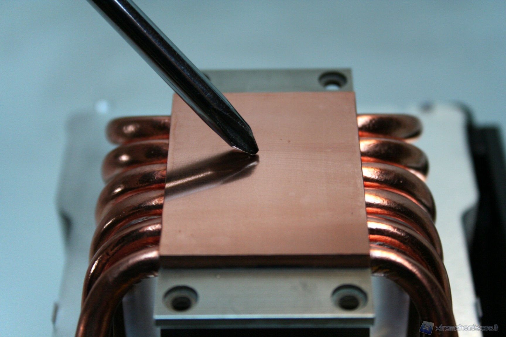 NOTA : al termine della sessione di test abbiamo notato che l’area di contatto tra l’IHS e la base del dissipatore non era omogenea. Abbiamo provato a cambiare posizionamento, ottimizzare le tensioni dovute al sistema di montaggio ma il risultato complessivo non è stato soddisfacente. E’ stato necessario fare più pressione del dovuto e mettere un quantitativo di pasta termica superiore al normale, per ottenere le performance che vedete in questa recensione. Consigliamo a Cooler Master l’adozione di un nuovo sistema di montaggio in quanto il dissipatore purtroppo risente in parte di questo problema. Se ci fosse una pressione omogenea e se ci fosse anche una zona di contatto sull’intera superficie della CPU i risultati sarebbero addirittura migliori. Thermalright adotta una leggerissima curvatura della base di contatto, per ovviare al problema dovuto al socket di ritenzione INTEL.