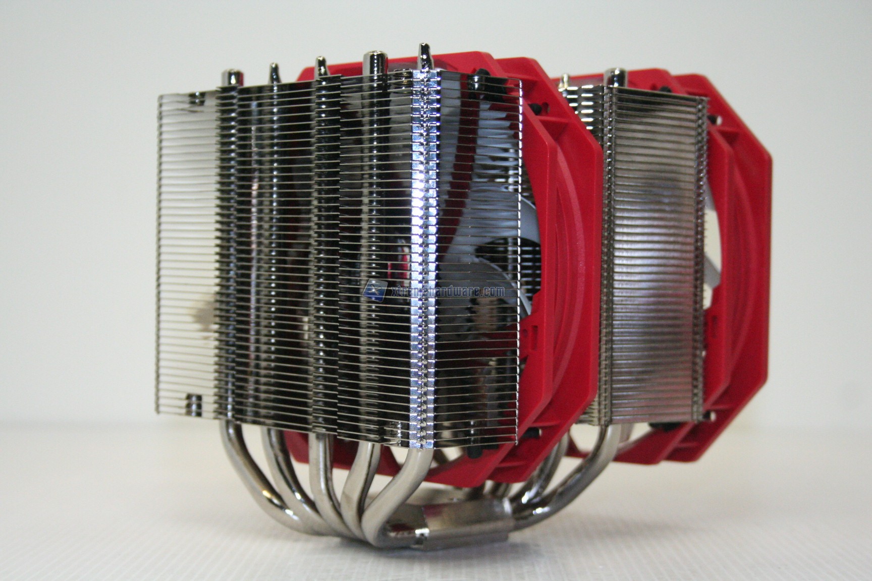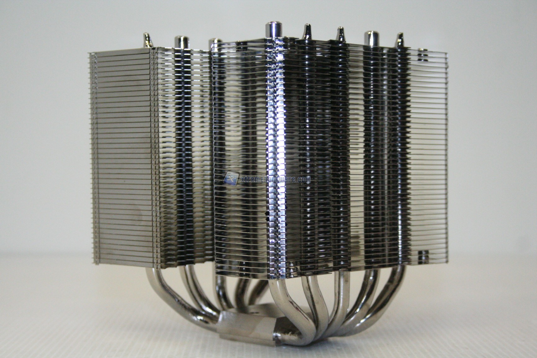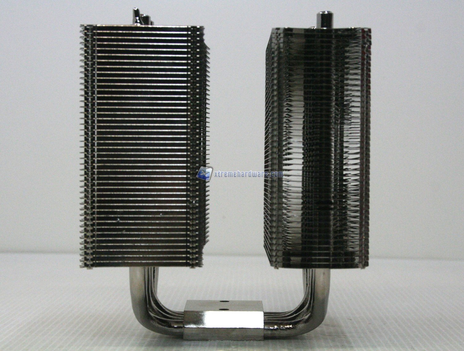 Il Tisis appartiene alla famiglia dei dissipatori a doppia torre di raffreddamento, quindi con una elevatissima superficie dissipante ed una innata predisposizione per ventole aventi bassi regimi di rotazione. Sotto questo punto di vista il Tisis è eccelso; come vedremo presenta una dissipazione semi-passiva fenomenale, complice anche l’adozione di due ottime ventole da 140mm. Presenta 5 heatpipes ad “U” da 8mm, distribuite uniformemente al centro di ogni torre di raffreddamento. Nella torre anteriore, è presente un profilo con un motivo strutturale simile al modello Noctua NH-D14, ed infatti preannunciamo che il Tisis riuscirà a competere molto bene con la versione Noctua. Al centro è presente una curvatura verso il centro della torre, che permette una migliore organizzazione dei flussi in uscita, e quindi in immissione verso la ventola centrale. Tale accorgimento non è affatto peculiare, poiché nel corso degli anni si è reso necessario per migliorare il profilo di ventilazione interno in associazione alla zona morta di ventilazione, derivante dal diametro elevato del motore.