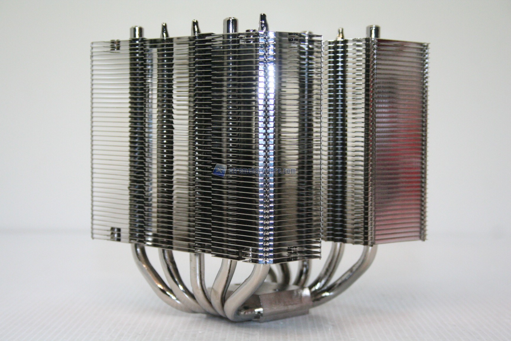 La base presenta una superficie leggermente convessa, ed è una caratteristica di quasi tutti i modelli usciti in commercio da anni, ad aria e con base non HDT/CDC. E’ intenzionale poiché ovvia a problematiche potenziali di contatto con l’IHS della CPU spesso ricurvo a causa del sistema di ritenzione della scheda madre. Sul socket LGA 2011, questo problema non è presente e tale accorgimento non è a nostro avviso necessario: anche i dissipatori con superficie perfettamente planare generalmente riescono ad avere un’ottima impronta e quindi buone prestazioni.