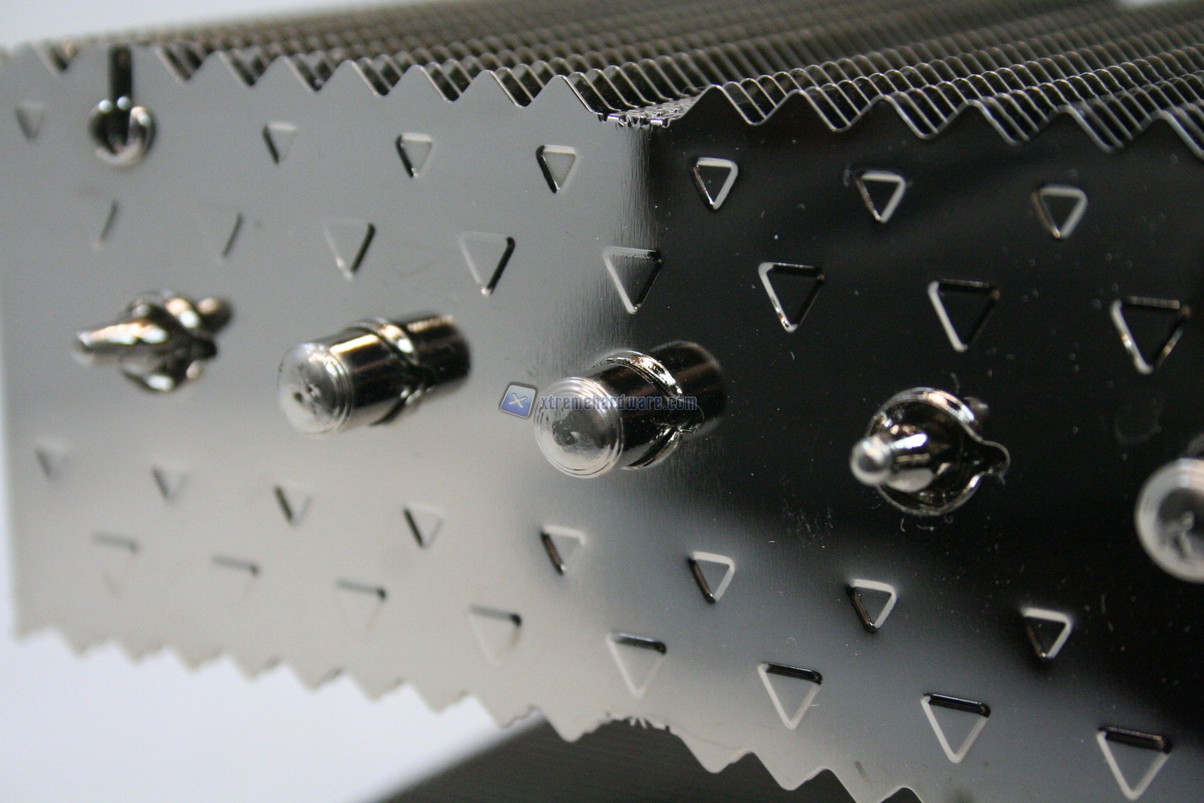 La scudatura finale delle heatpipes è anch’essa nichelata, quindi anche qui si è su livelli molto elevati, sebbene però la solidità strutturale non sia eccezionale. Presenta una configurazione stock 2xPush (anteriore e centrale) ed è anche possibile aggiungerne una terza posteriormente, anche se saranno necessari altri fermi gommati, non inclusi nella confezione.