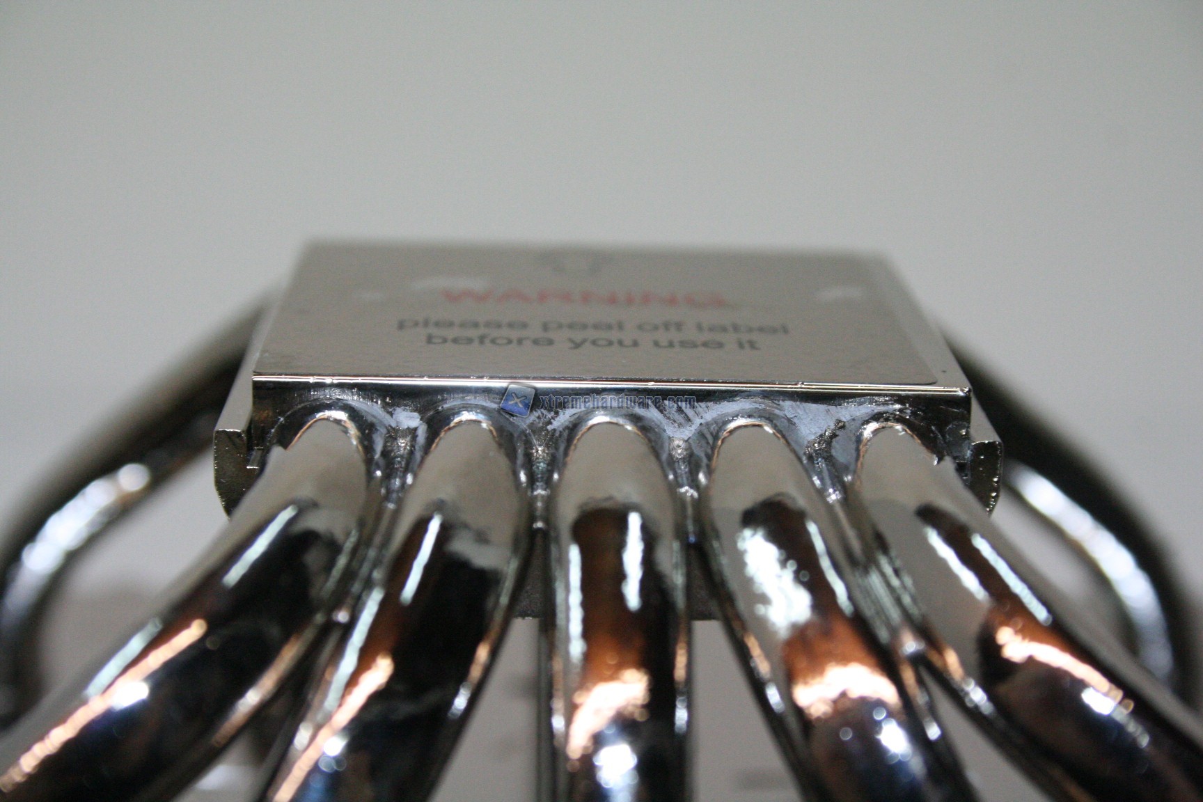 La base è convessa, però è lappata a specchio e di elevata qualità, senza nessun segno di lavorazione al tornio. Le saldature sono evidenti, leggermente sporche ma in perfetta corrispondenza delle heatpipes.